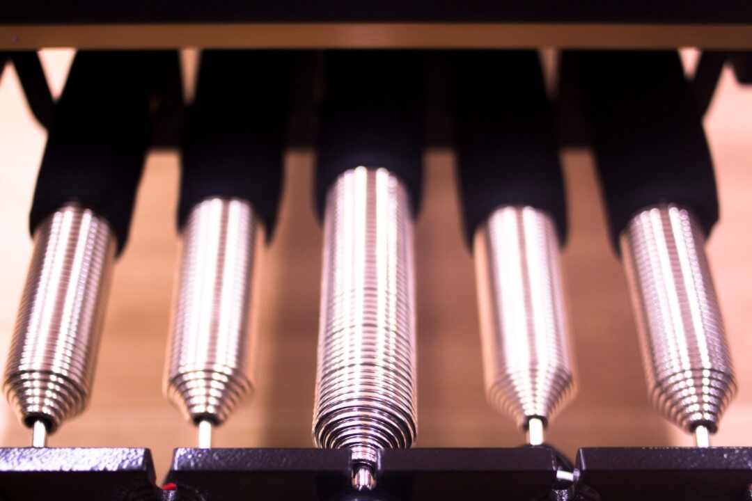 というのもマシンピラティスの大きな特徴の1つは写真のようなスプリングという強度が違うバネがついていることです。主にこのバネの重さを変えて強度を調節することができます。