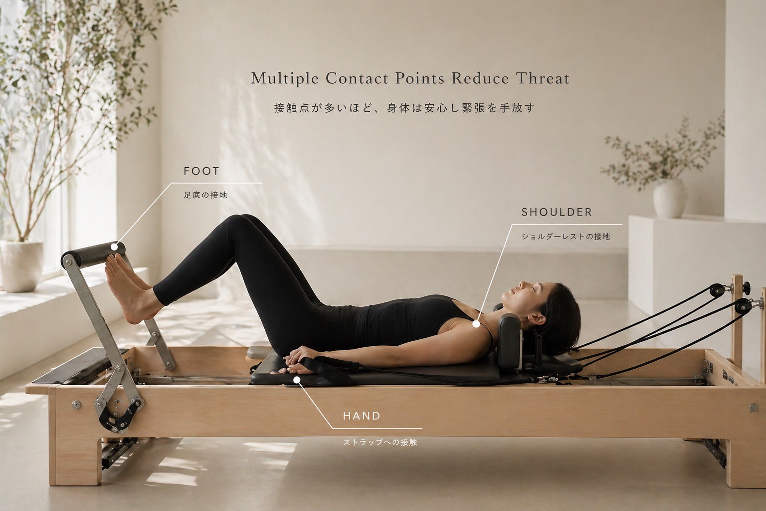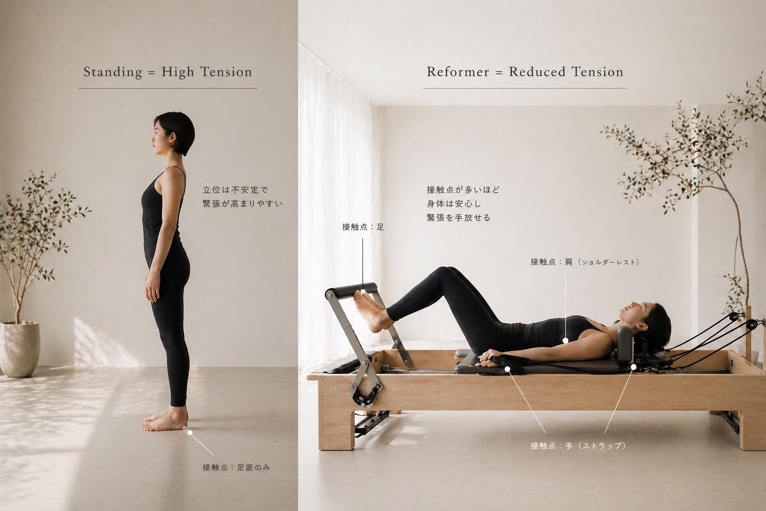 リフォーマーは単なる「負荷をかけるマシン」ではなく、過緊張を抑えながら安全に運動できる環境を作るツールです。