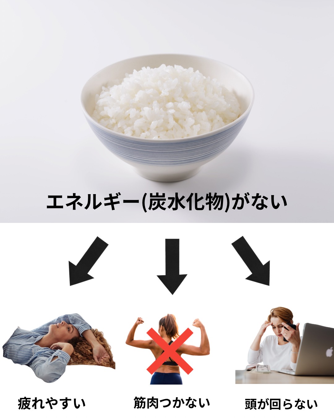 このような方は当然エネルギーがないので疲れやすいですし、筋肉もつきづらいですし、頭も回りづらいです。少しづつ炭水化物を中心として食事量を増やしながら代謝できる身体作りをしていかなければ健康的な身体は作られません。