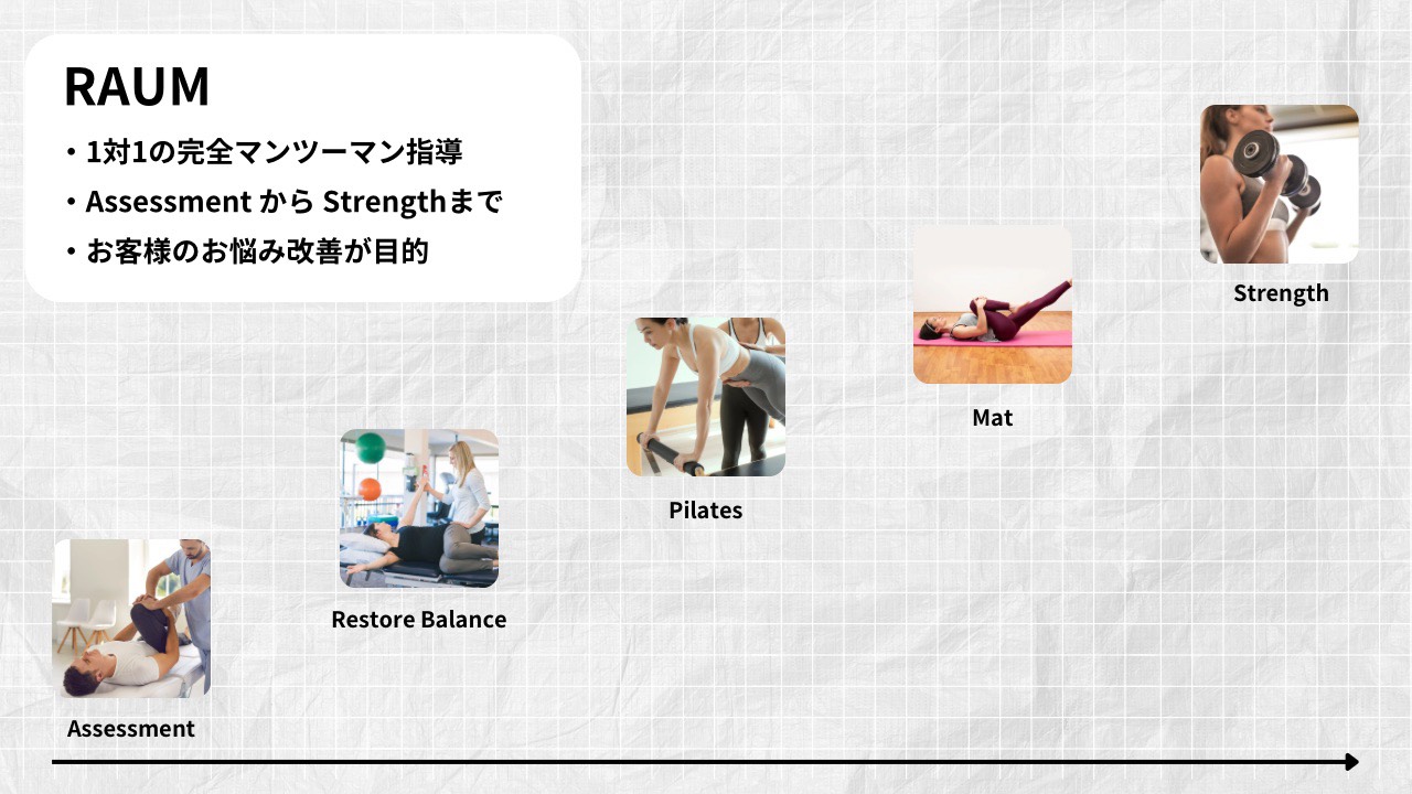 またRAUMではマシンピラティスを取り入れておりますが、ピラティスが上手くなるためのピラティスではなく慢性痛や姿勢改善などを達成するための一つのツールとしてマシンピラティスを取り入れています。