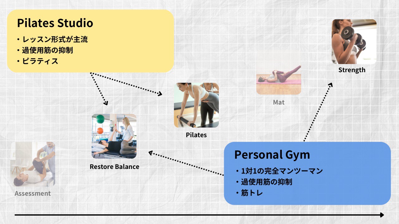 通常のピラティススタジオやパーソナルジムのアプローチ法